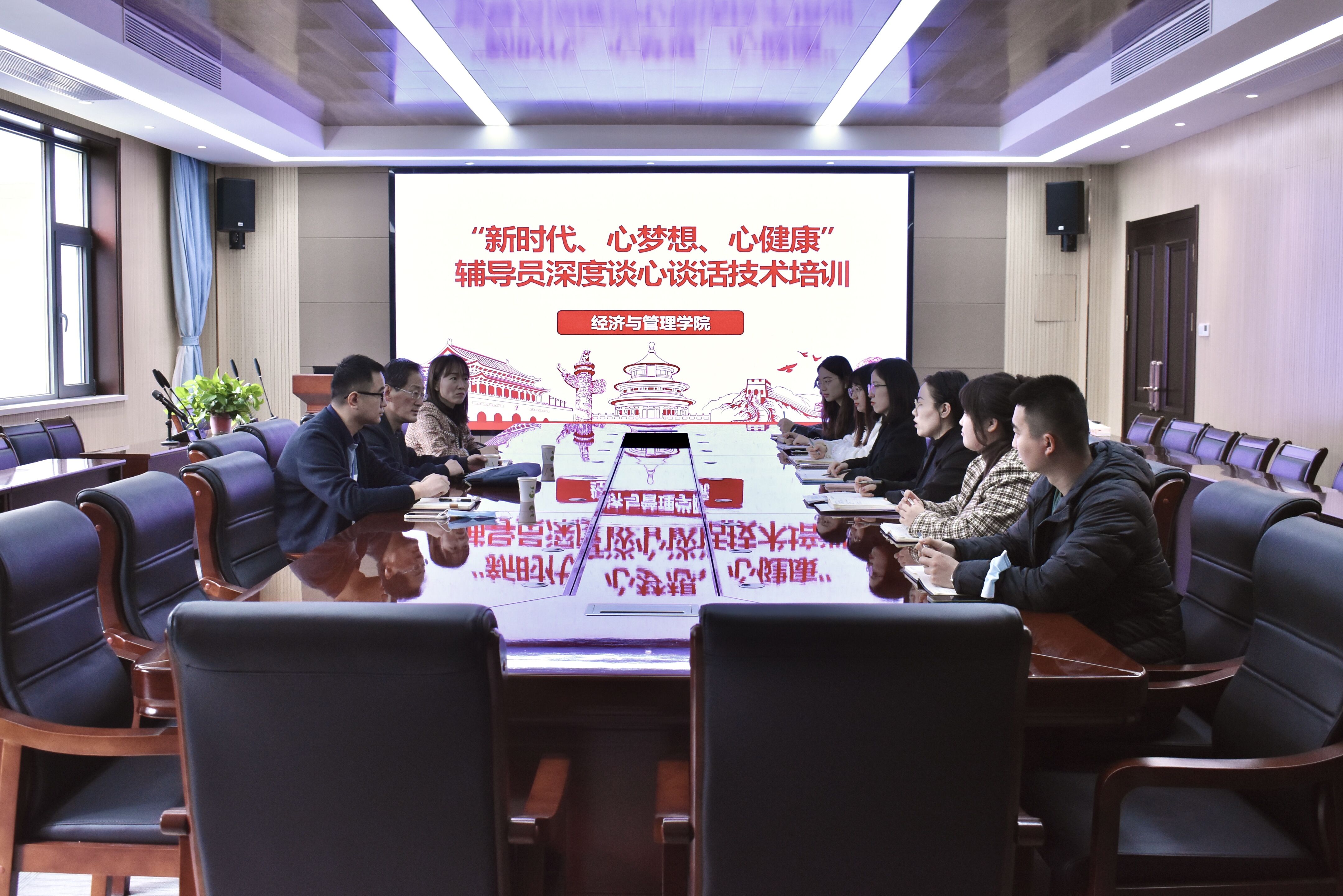 于经管楼313会议室组织开展“新时代、心梦想、心健康”学工队伍深度谈心谈话技术培训会,学院党委书记李德成出席会议,培训会邀请青岛科技大学心理中心主任李海玲、专职咨询师王岳飞主讲,学院全体辅导员参与培训会。