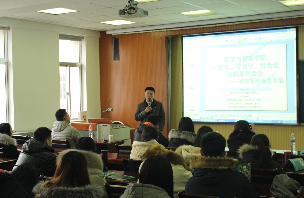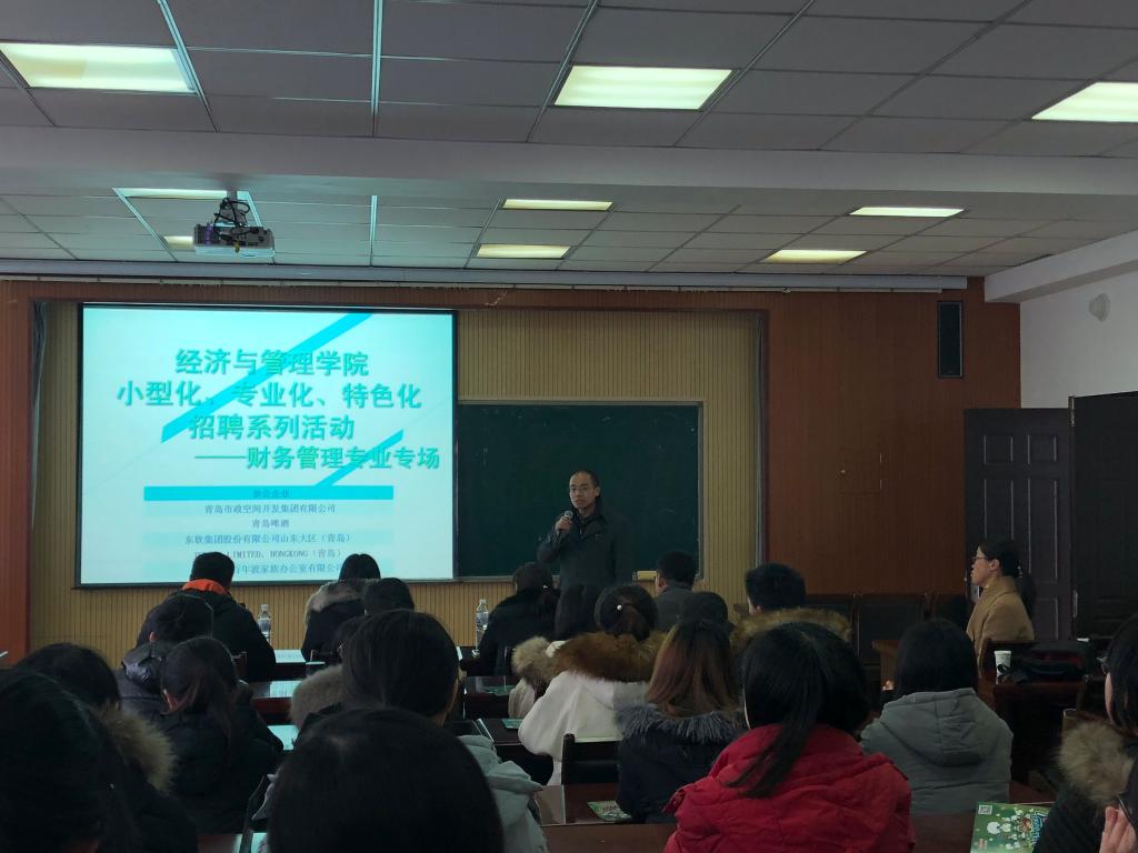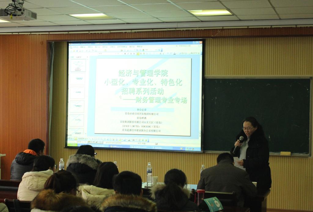 12月15日下午,经济与管理学院小型化、专业化、特色化招聘系列活动——财务管理专业专场在经管楼419室成功举办,青岛啤酒山东大区财务总监王国清\青岛市政空间开发集团有限公司子公司财务总监李翠艳、东软集团股份有限公司山东大区财务总监高雪松、JSPACE LIMITED HONGKONG(青岛)财务总监薛红梅、青岛百年渡家族办公室有限公司行政经理孟丽君代表企业前来招聘。熟女探花