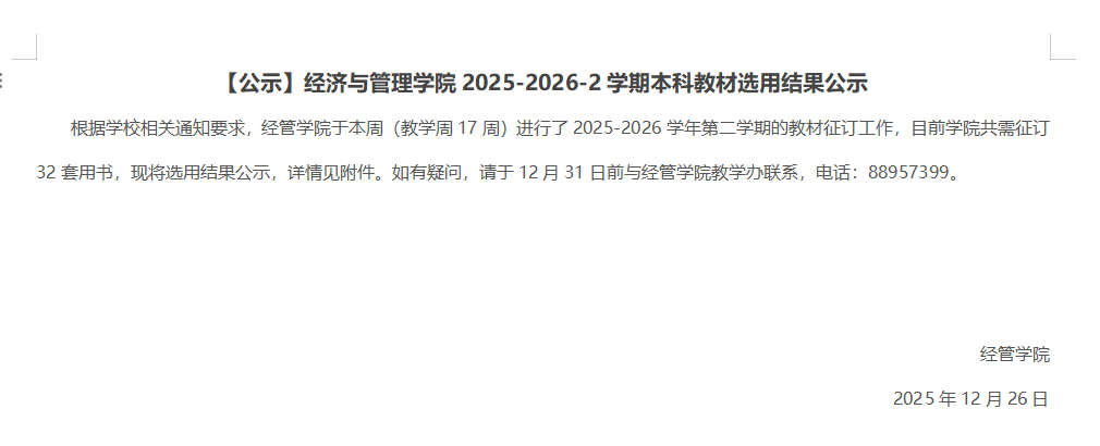 【公示】经济与管理学院2025-2026-2学期本科教材选用结果公示