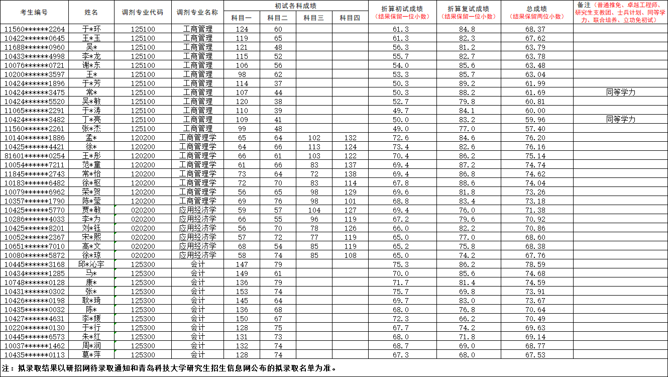 青岛科技大学经济与管理学院2026年硕士研究生招生复试成绩公布(调剂)
