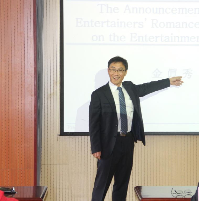 金真秀教授就电影明星的绯闻对所属公司股市的影响做了报告。报告中金教授讲述了新的研究方法event study,该方法从account和deny两方面就绯闻对所在公司股价的影响进行了讨论,同学们积极参与讨论。此方法是由金教授自己研究,在世界上也是唯一,比较具有探究性。