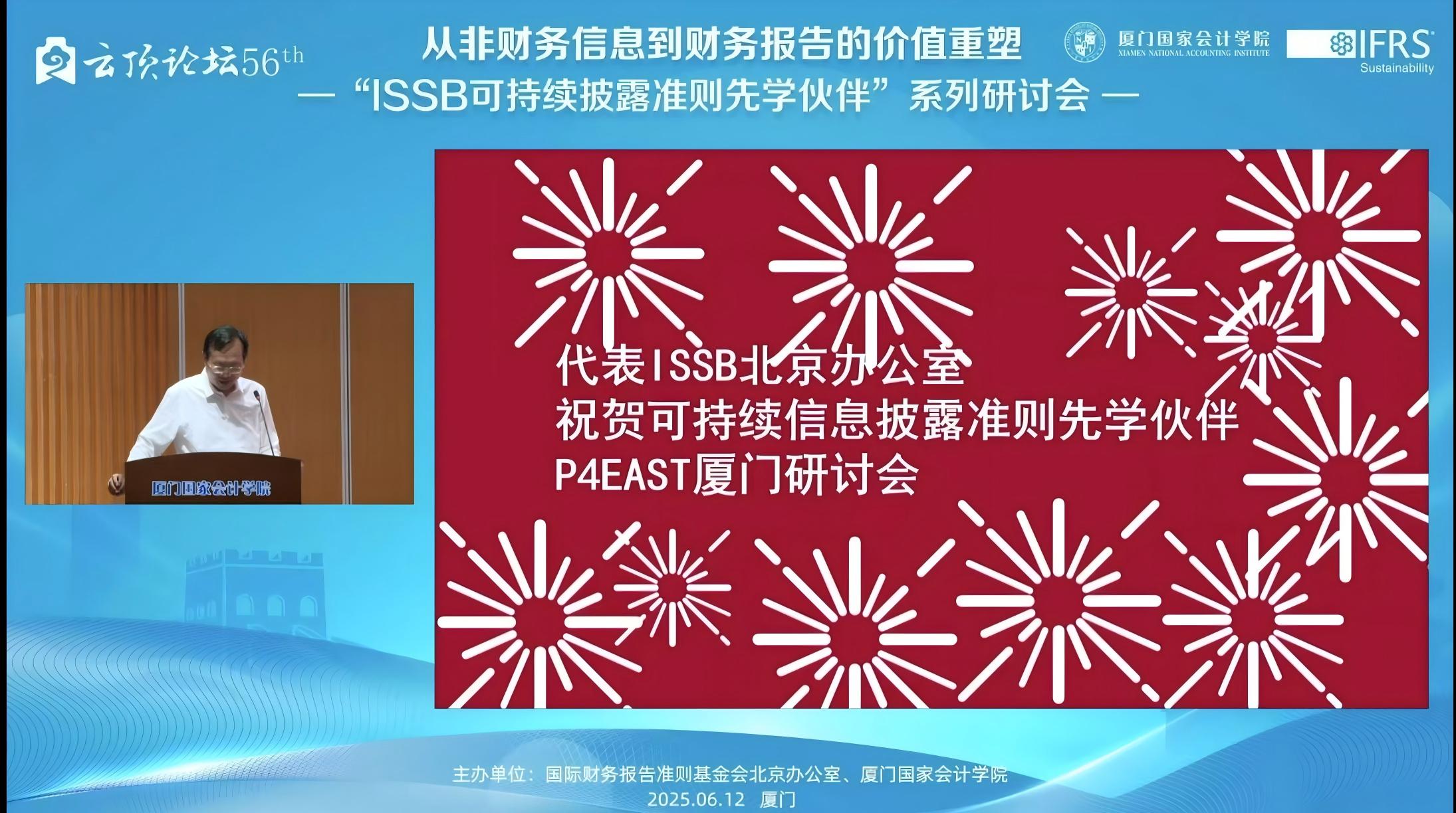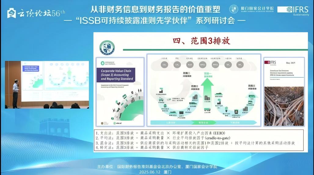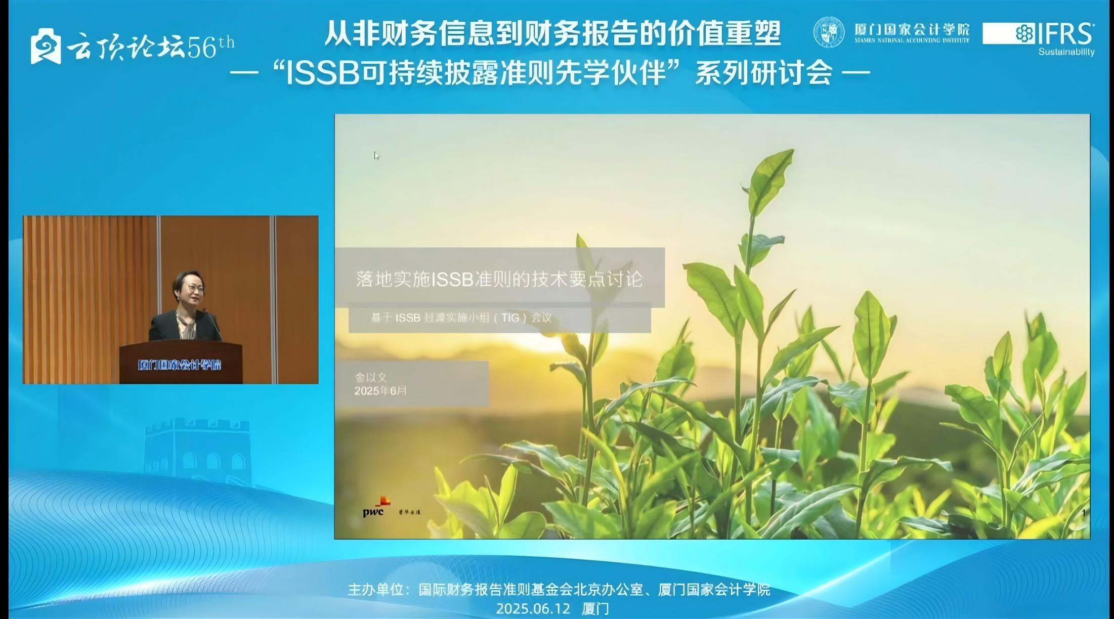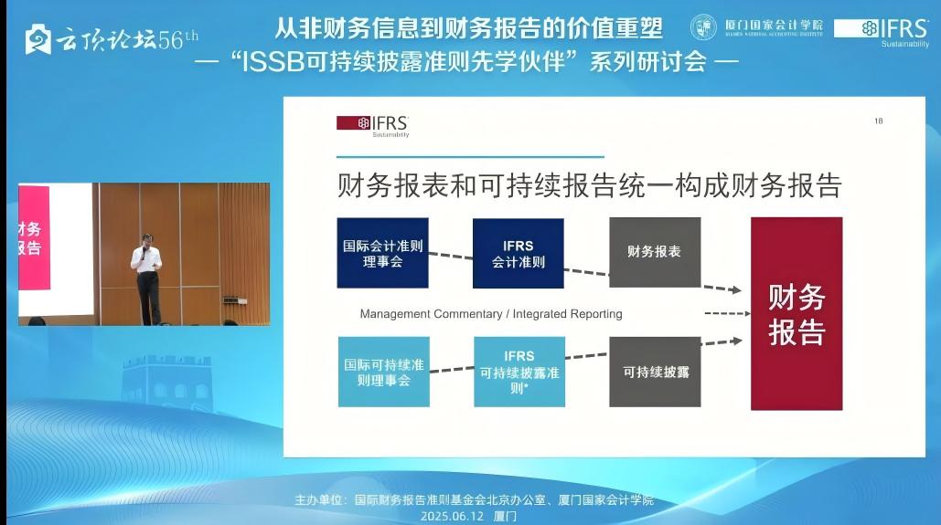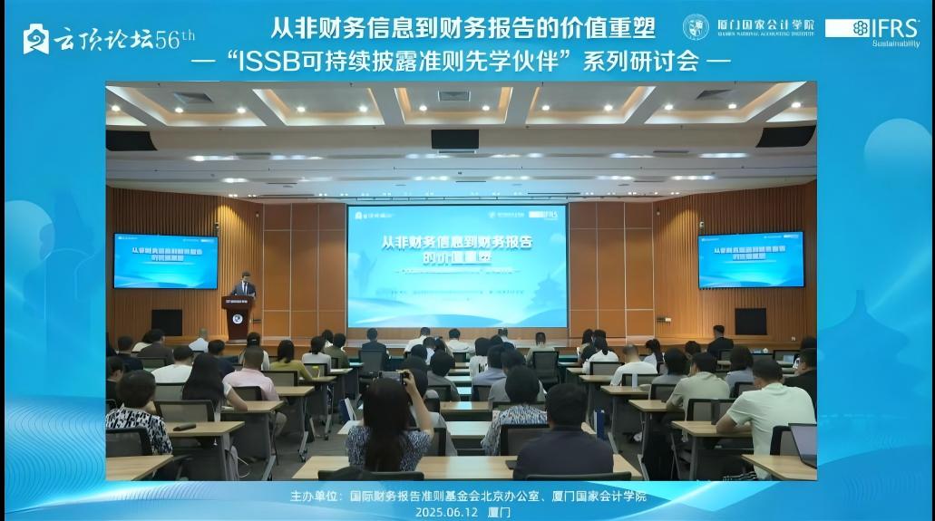 2025年6月12日,下午14:00——17:15,由国际财务报告准则基金会北京办公室与厦门国家会计学院主办的,第56届云顶论坛:从非财务信息到财务报告的价值重塑——“ISSB可持续披露准则先学伙伴”厦门研讨会在厦门国家会计学院学术报告厅B区顺利举办。同时,我校MPAcc学生也通过厦门国家会计学院微信公众号的直播同步参与了该学术讲座。