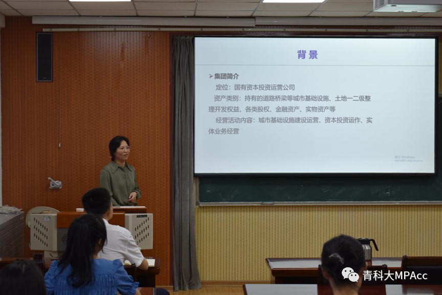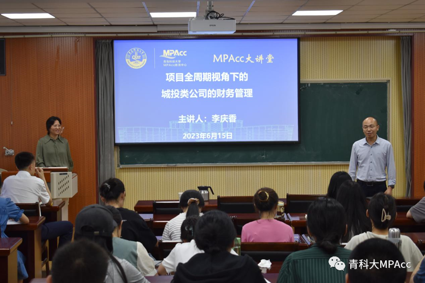 本次报告会主题是“项目全周期视角下的城投类公司的财务管理”,报告人是MPAcc校外导师、青岛城市建设投资(集团)有限公司总经理助理兼财务资金部总经理李庆香女士