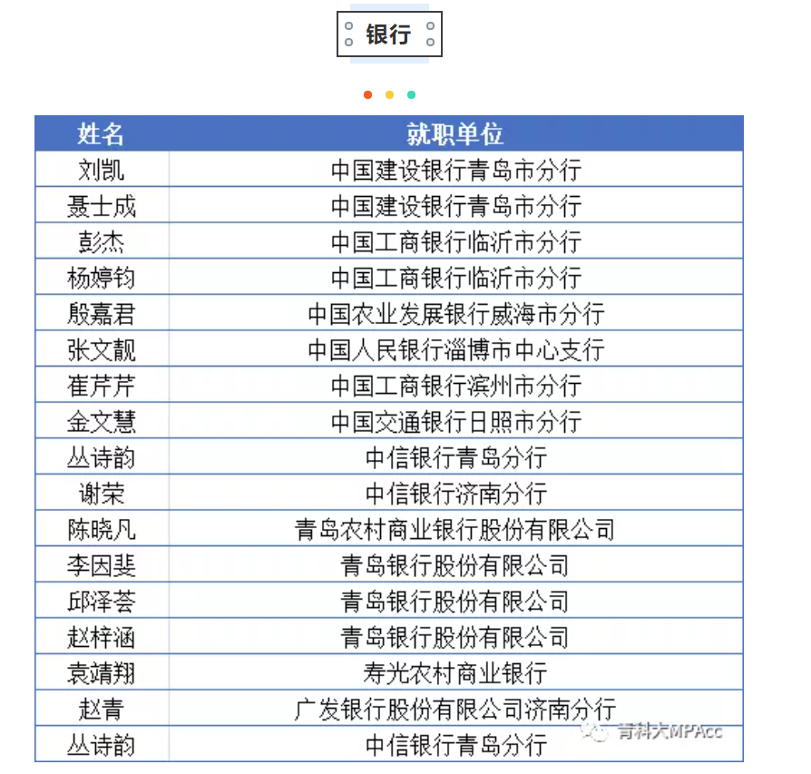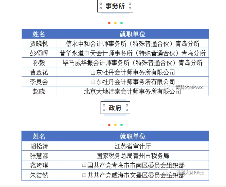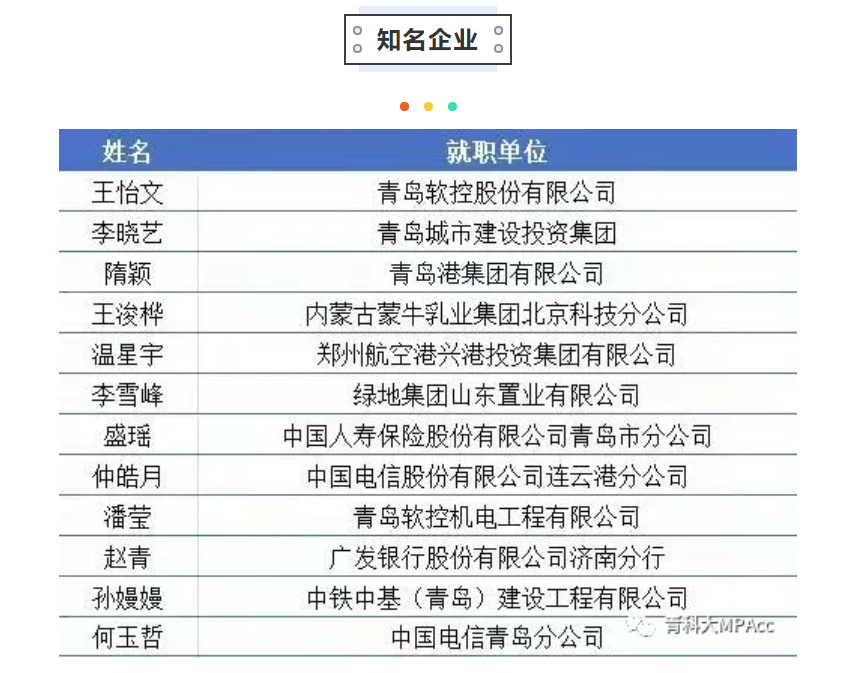 青岛科技大学MPAcc教育中心贯穿以人为本的教育理念,全员育人、全方位育人,毕业学生大多进入知名企业、银行、事务所或者政府等。部分优秀校友的就业去向如下:
