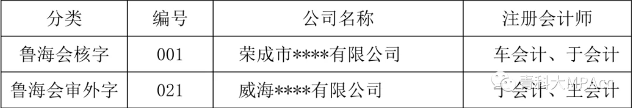 事务所的审计业务大体分类设置为会审内、会审外、会核、会验、税审、税核等,审计底稿也据此分类。由于登记册为公司内部资料不可拍照,此处以会核大类的荣成市****有限公司2018年度审计报告和会审外大类的威海****有限公司2018年度审计报告为例,登记格式如下: